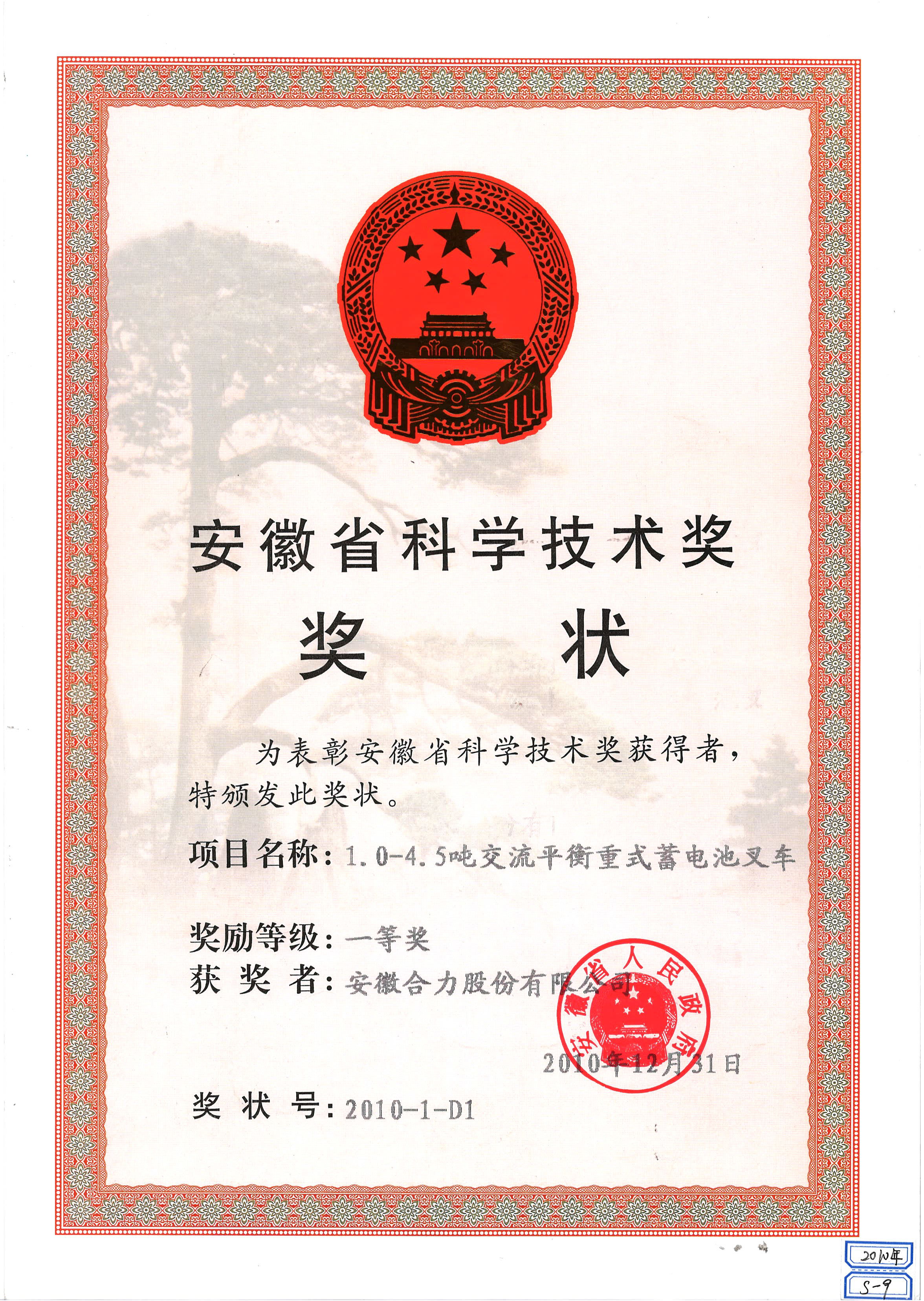 2010 安徽省科學(xué)技術(shù)獎獎狀:1.0-4.5噸交流平衡重式蓄電池叉車一等獎