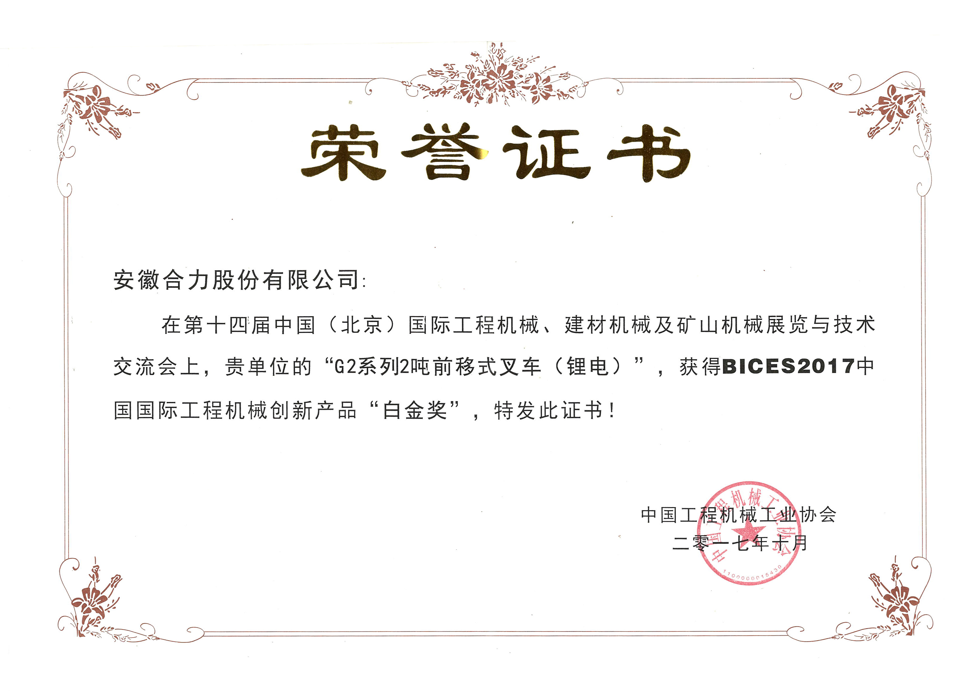 2017 中國國際機(jī)械白金獎G2-2噸前移式鋰電