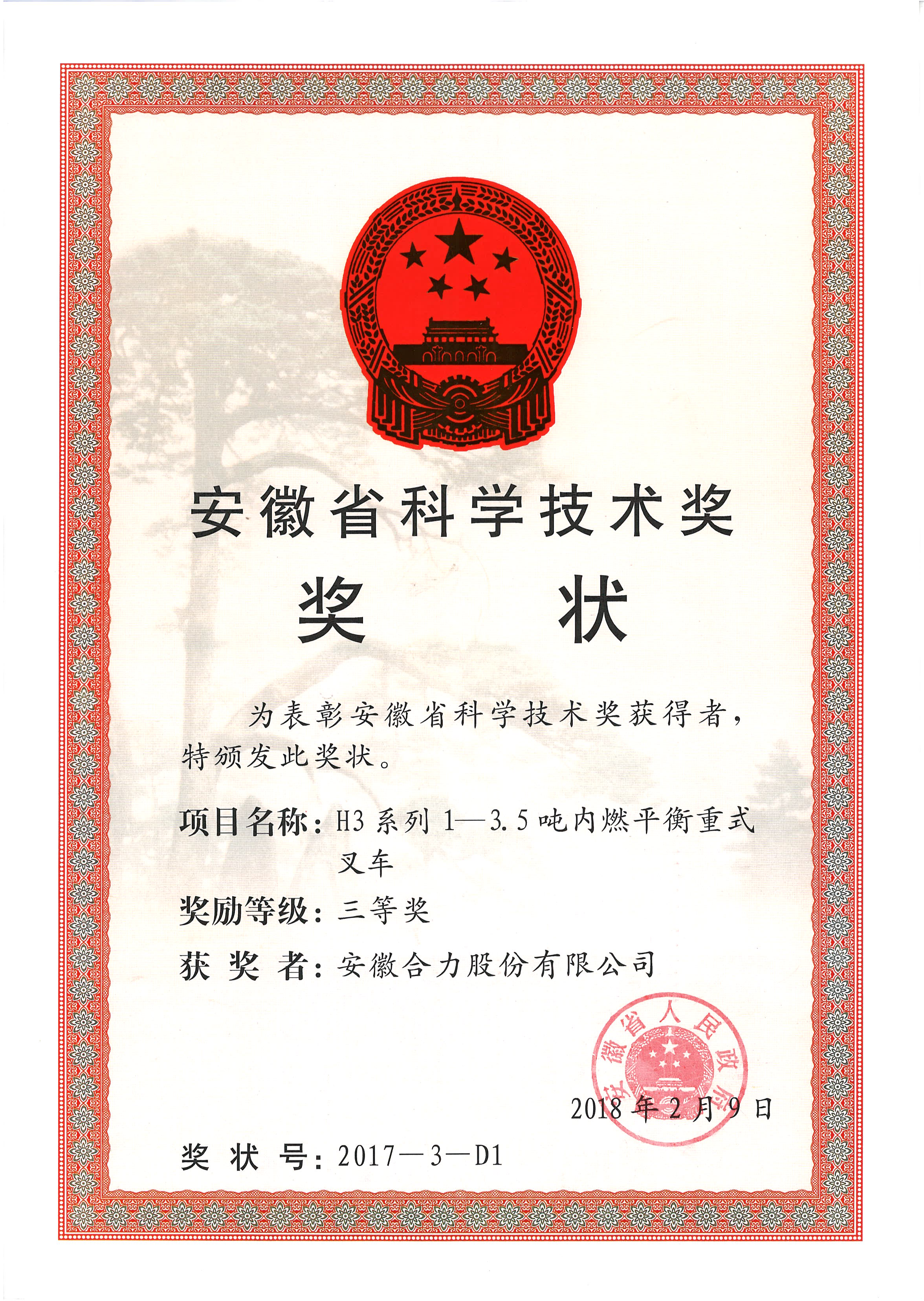 2018 安徽省科學(xué)技術(shù)獎三等獎 H3系列1-3.5噸內(nèi)燃平衡重式叉車